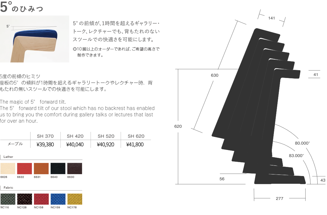 5度の前傾が、1時間を越えるギャラリー・トーク、レクチャーでも背もたれのないスツールでの快適さを可能にします。